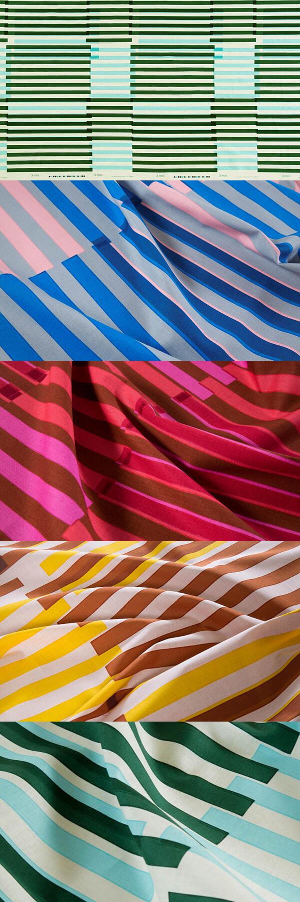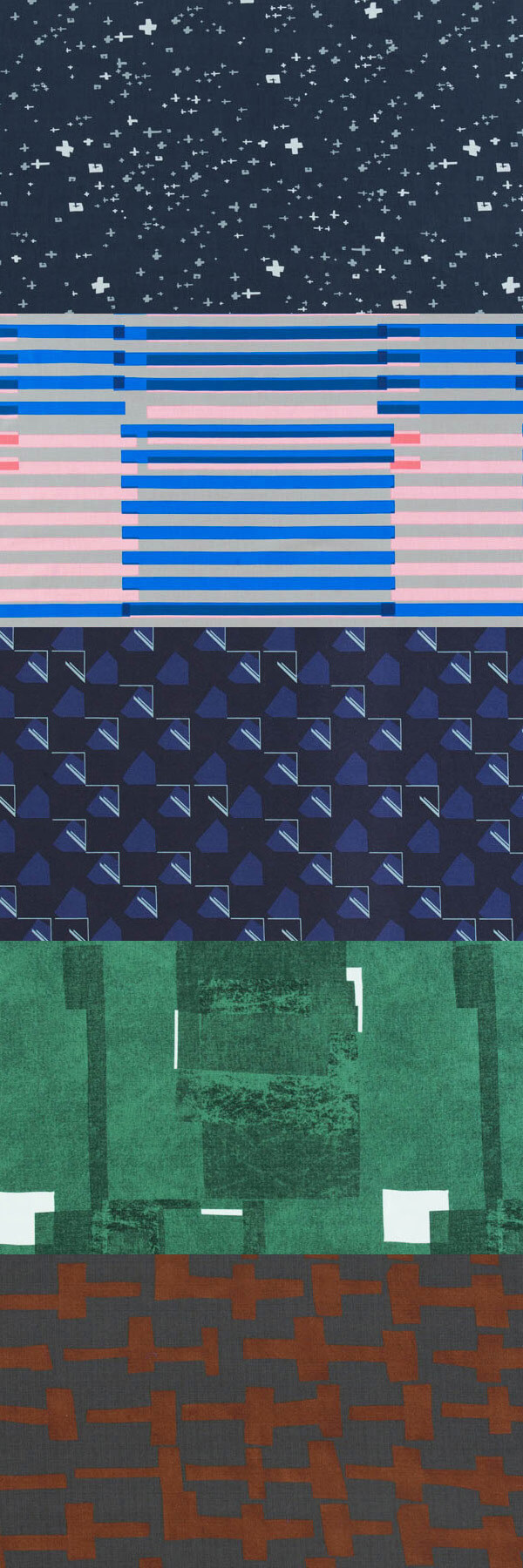 「ナイトクルージング」というテーマで、夕方から夜にかけての風景を描いたテキスタイル。5タイプ17色。これまでになく、ダークなトーンが印象的なテキスタイルが勢ぞろい。上から、neon、night view、window light、壁、dark woods(画像クリックで拡大)