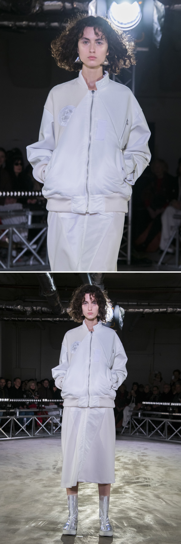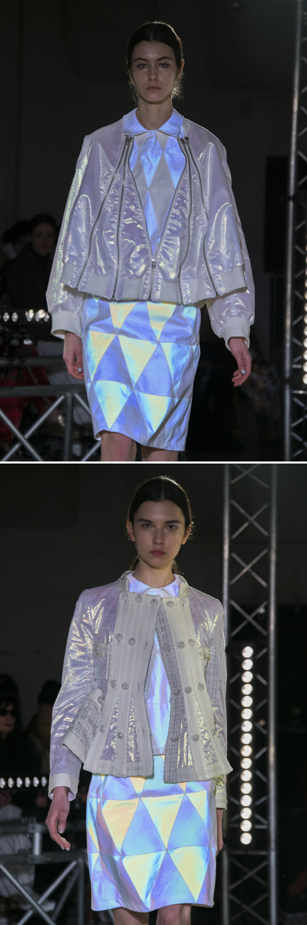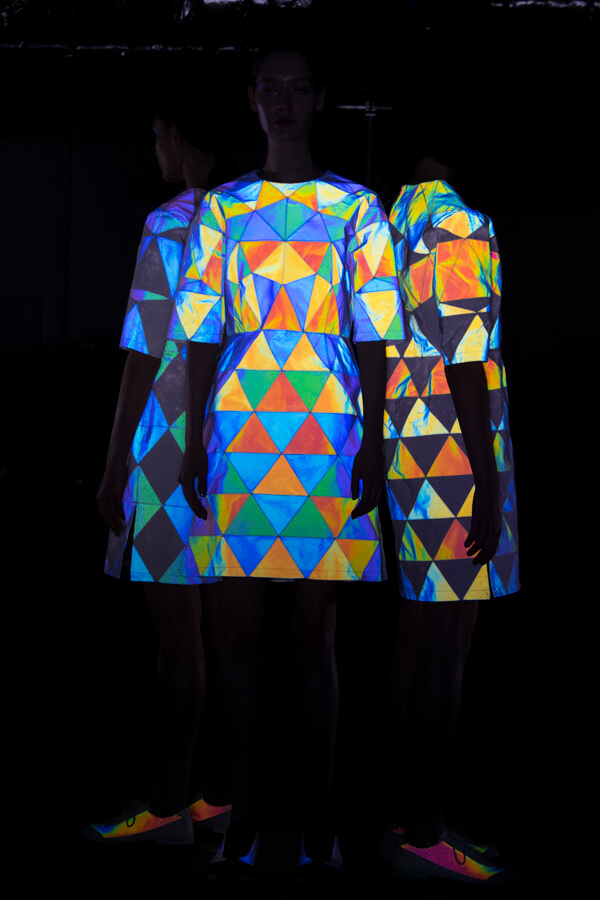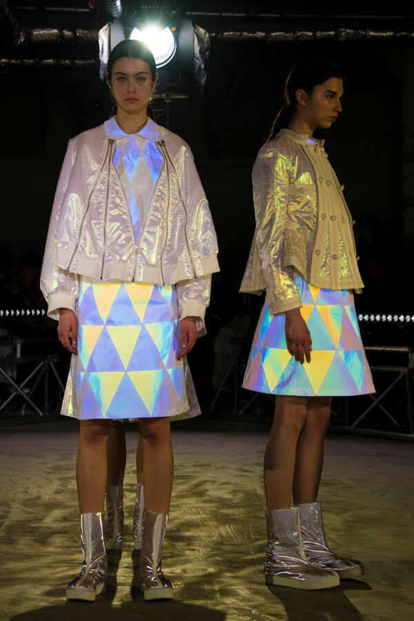 中でもラストに登場したのは、表面にプリズム効果のある微細なビーズ状の素材をコーティングした服。