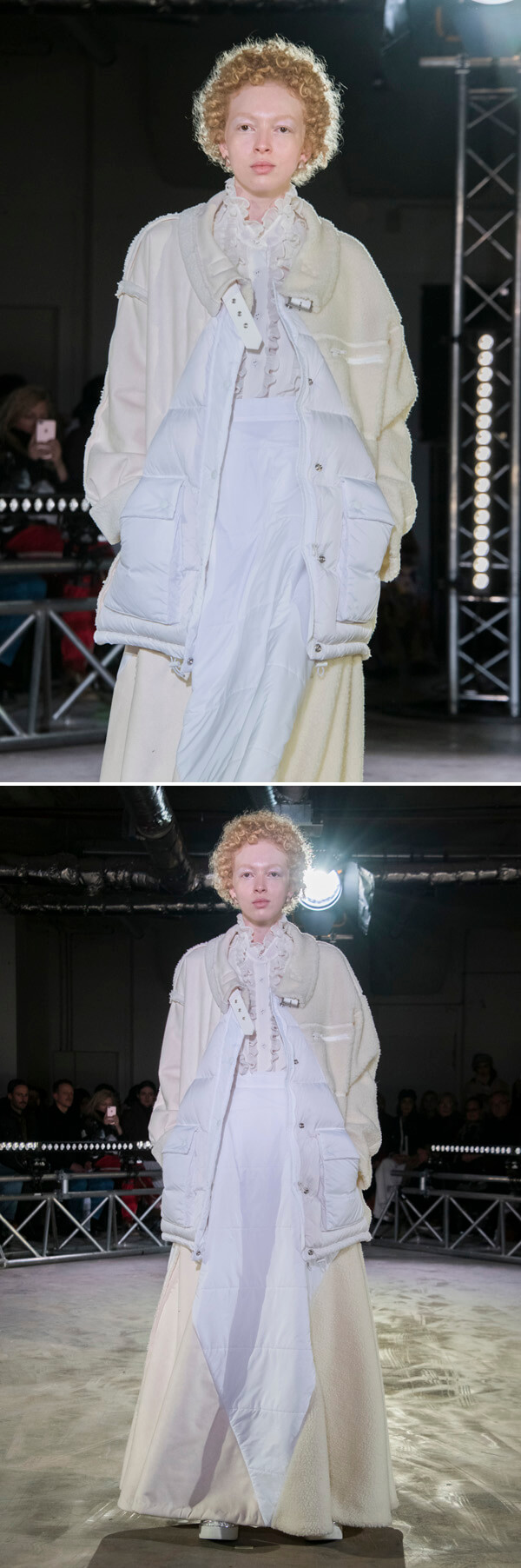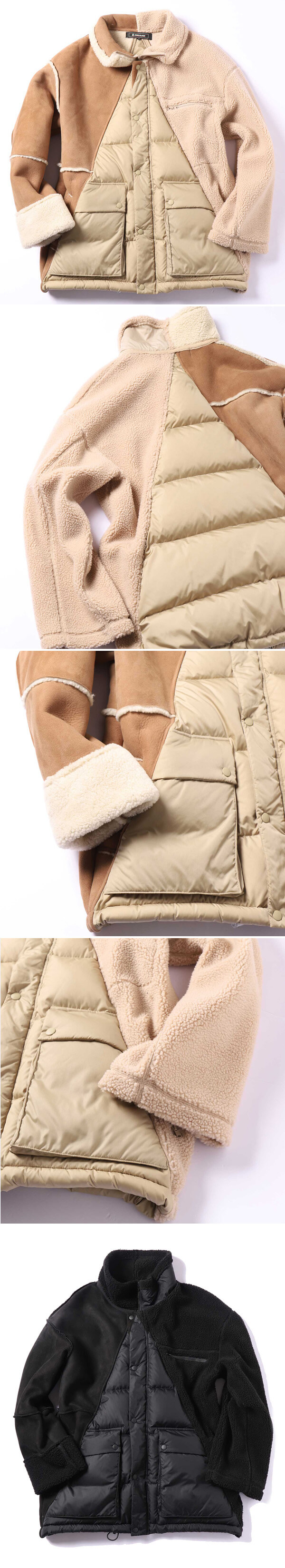 この服は、右腕がムートンジャケット、左腕がボアジャケット、体がダウンジャケットで構成されています。つまり、ひとつの同じ服なのに、見る方向によって全く違う服を着ているように映り、着る人も左右の質感や重さが全く違うという、不思議な不同一感を味わうことになります。