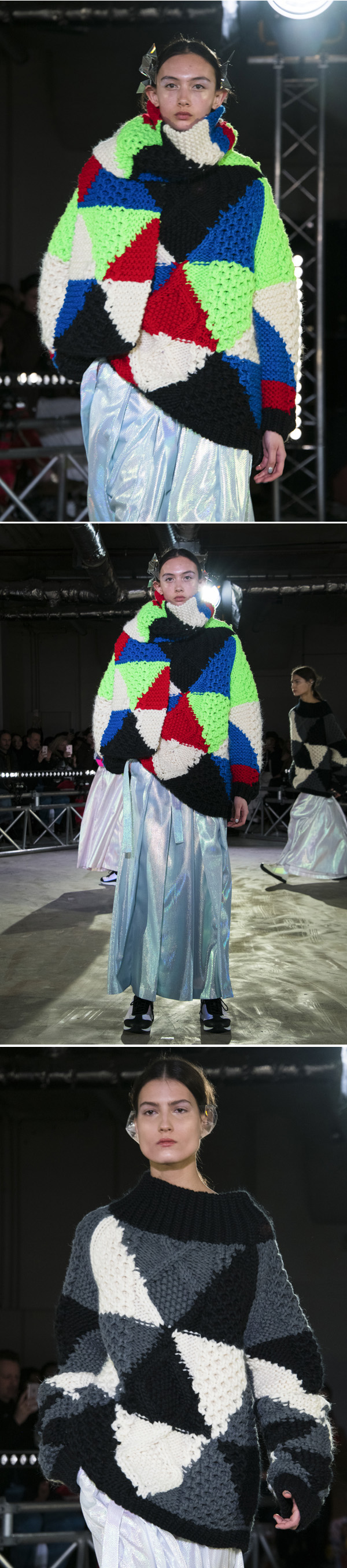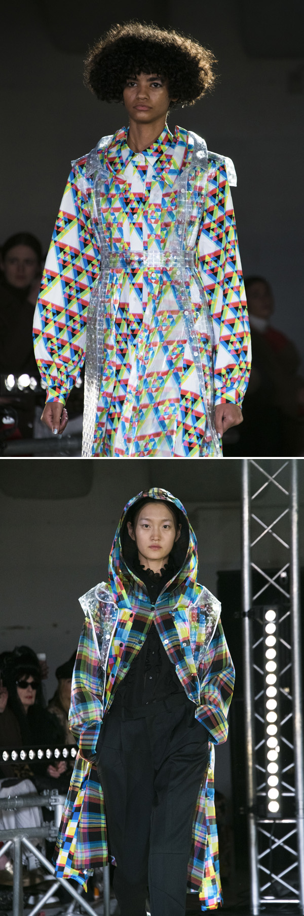 他にも光の屈折によって、透かして見たときに像が二重になって見える透明な素材など、服の像を多重化させ、ずらす仕掛けが施された素材やデザインが用いられている今回のコレクション。