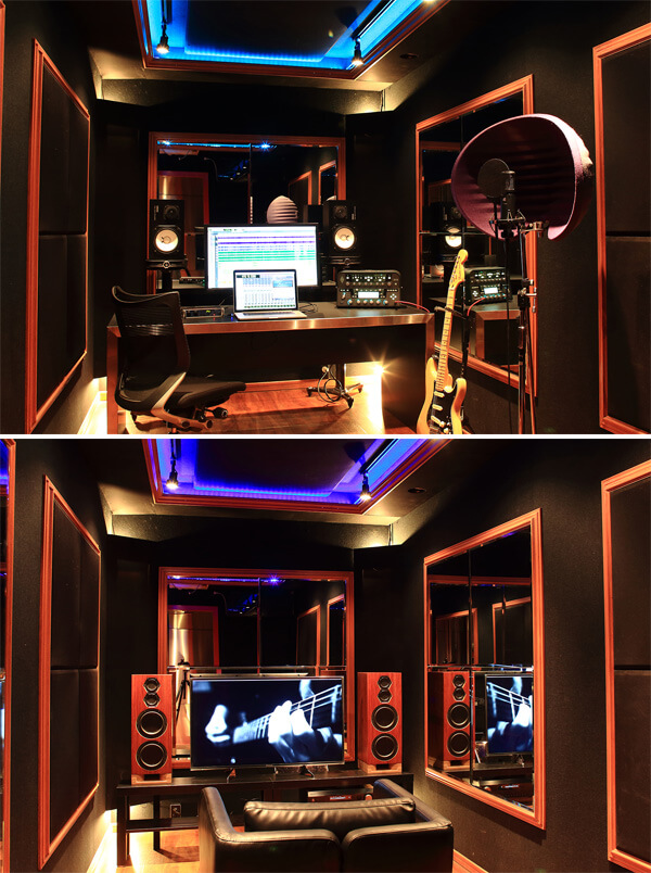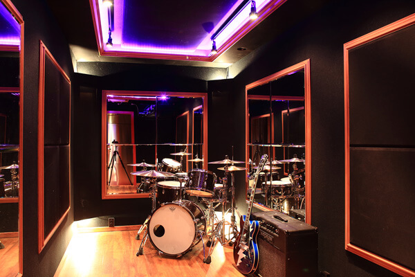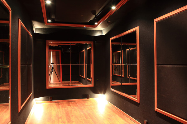 写真で壁面に設置されているフレーム付きの鏡や、吸音材はオプション。希望があれば、壁面に窓を空けることもできるので、防音性が少し下がっても、開放感を重視したい方は、予算が許せば設置を検討しても良いかもしれません。